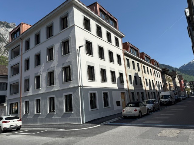 zurück Vier Stadtwohnungen und drei Stadthäuser Postgasse Glarus Neubau mit Holz-/Aluminium-Fenster Architekt Jung Generalunternehmung GmbH Näfels Bauherr Jung Generalunternehmung GmbH Näfels Bauleitung Jung Generalunternehmung GmbH Näfels Realisierung 2024 + 2025